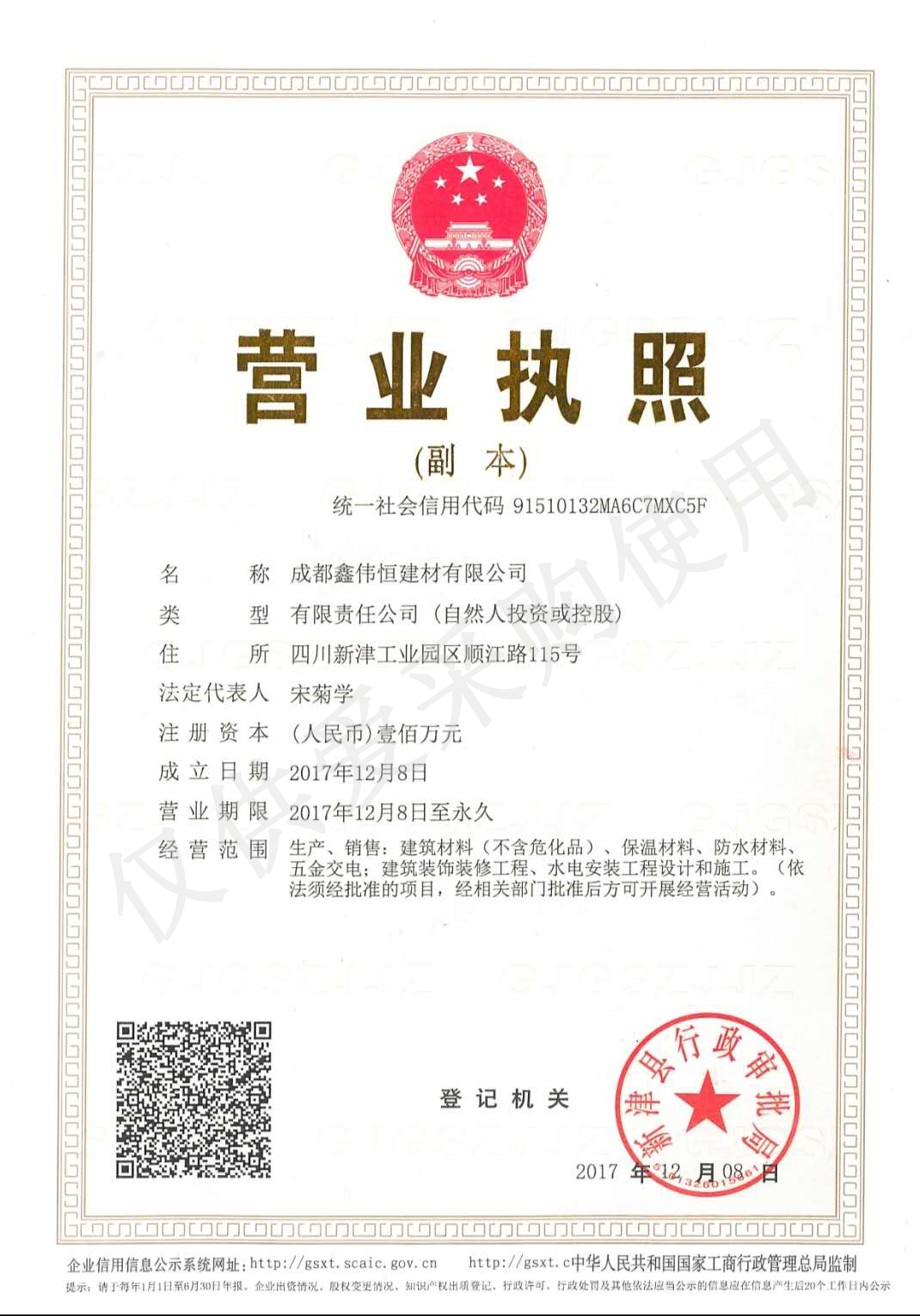 成都鑫偉恒建材有限公司注冊地址位于四川新津工業(yè)園區(qū)順江路115號,注冊機(jī)關(guān)為新津縣市場和質(zhì)量監(jiān)督管理局,法人代表為宋菊學(xué),經(jīng)營范圍包括生產(chǎn)、銷售:建筑材料(不含?;罚?、保溫材料、防水材料、五金交電;建筑裝飾裝修工程、水電安裝工程設(shè)計和施工。(依法須經(jīng)批準(zhǔn)的項(xiàng)目,經(jīng)相關(guān)部門批準(zhǔn)后方可開展經(jīng)營活動)。